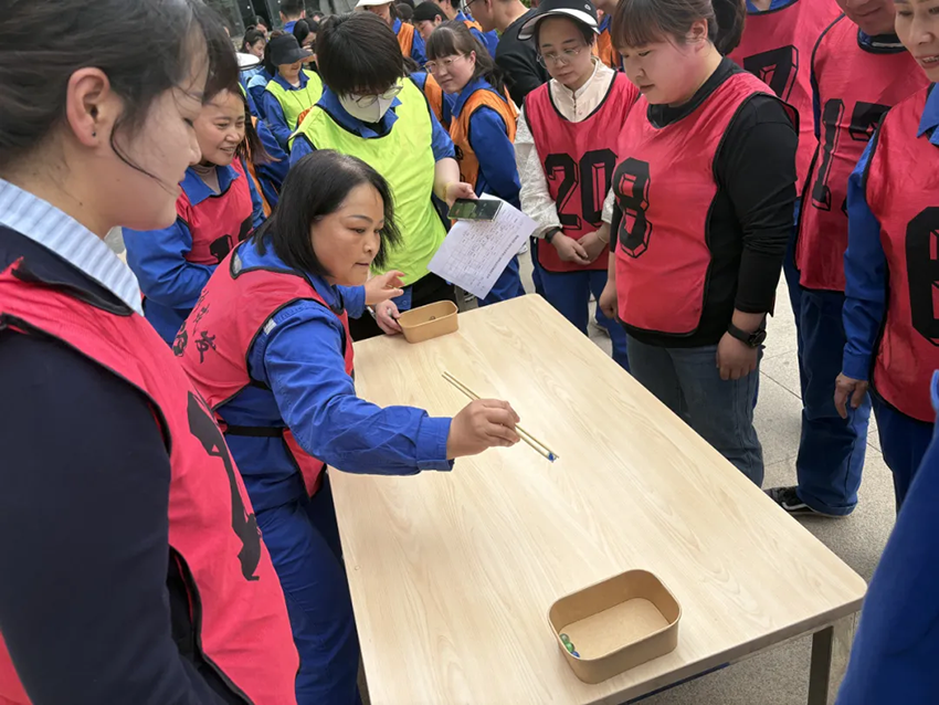 “夾珠大作戰(zhàn)” 看似簡(jiǎn)單,實(shí)則需要極強(qiáng)的專注力和手部控制力。選手們手持筷子,小心翼翼地將珠子從一個(gè)容器夾到另一個(gè)容器。有的職工動(dòng)作嫻熟,快速完成任務(wù);有的則略顯緊張,珠子幾次掉落,但依然不氣餒,堅(jiān)持完成比賽。