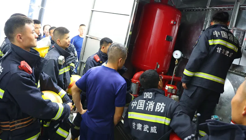 15時46分,涼州區(qū)消防中隊3輛消防車、20名指戰(zhàn)員抵達現(xiàn)場。“東側風向!”消防偵察組用風速儀測定風向后,指揮長果斷下令:“1號水罐車占據(jù)上風位設置水幕隔離帶,2號泡沫車利用罐區(qū)固定消防炮覆蓋燃燒罐體,3號搶險車準備泡沫管槍堵截相鄰罐區(qū)!”迅速將被困操作間的2名員工安全轉移出來;攻堅組成員穿戴隔熱服,用泡沫槍對10號罐罐壁進行降溫冷卻……