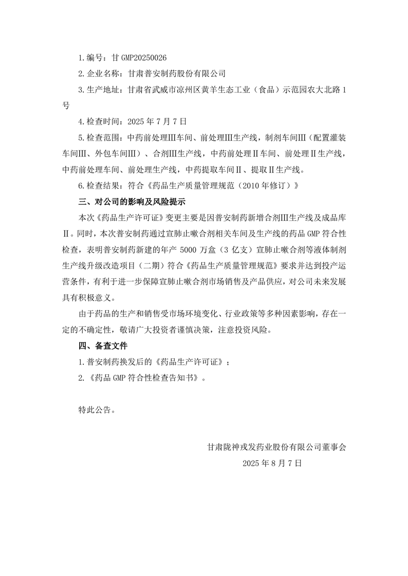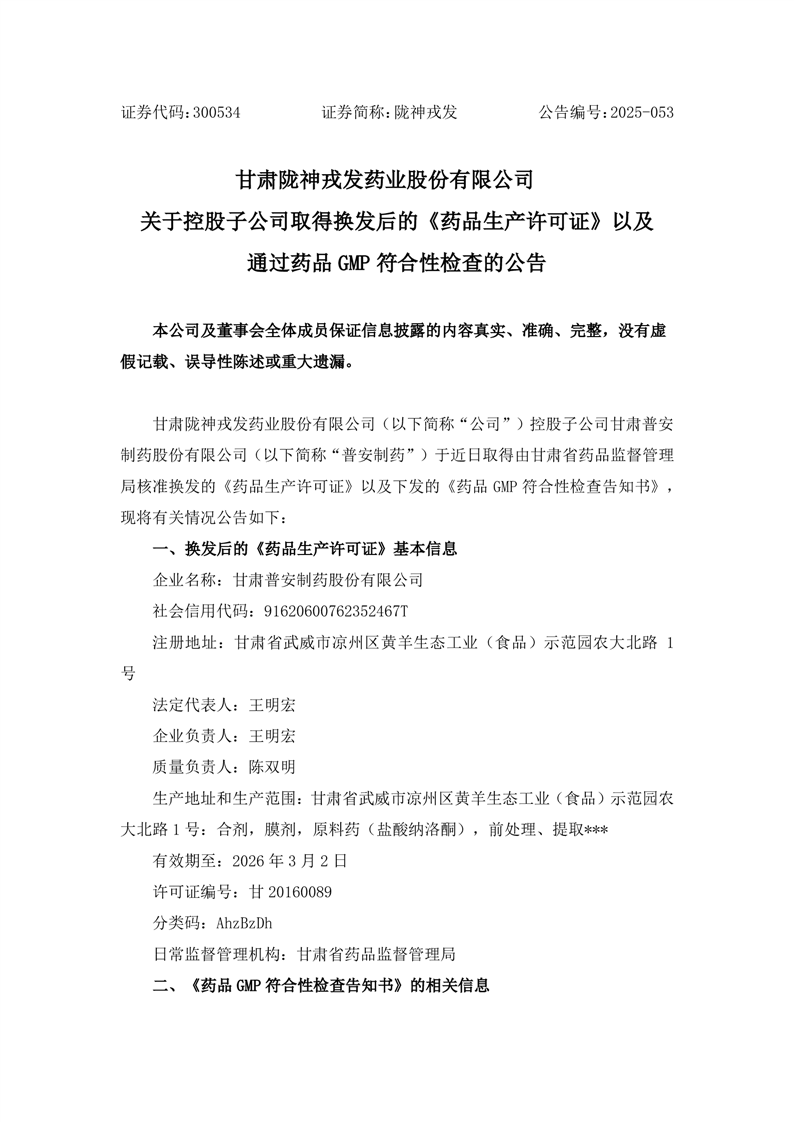 關于控股子公司取得換發(fā)后的《藥品生產(chǎn)許可證》以及通過藥品GMP符合性檢查的公告