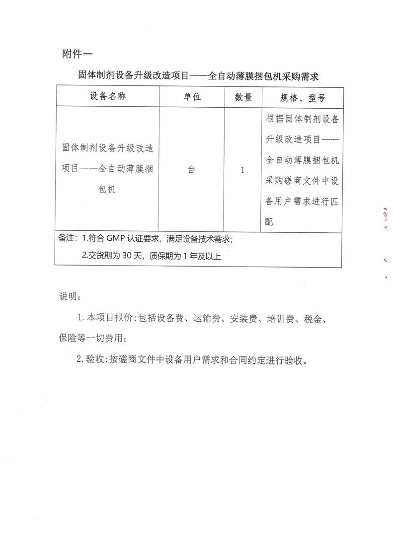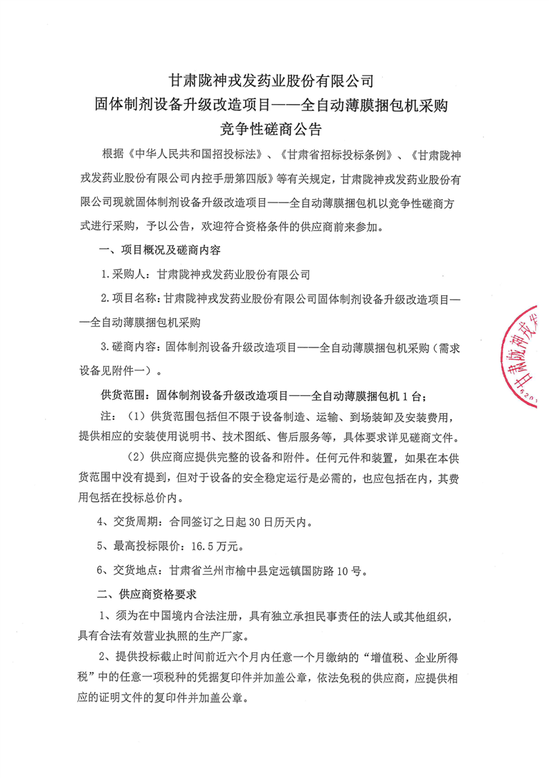 甘肅隴神戎發(fā)藥業(yè)股份有限公司固體制劑設(shè)備升級改造項(xiàng)目--全自動(dòng)薄膜捆包機(jī)采購競爭性磋商公告