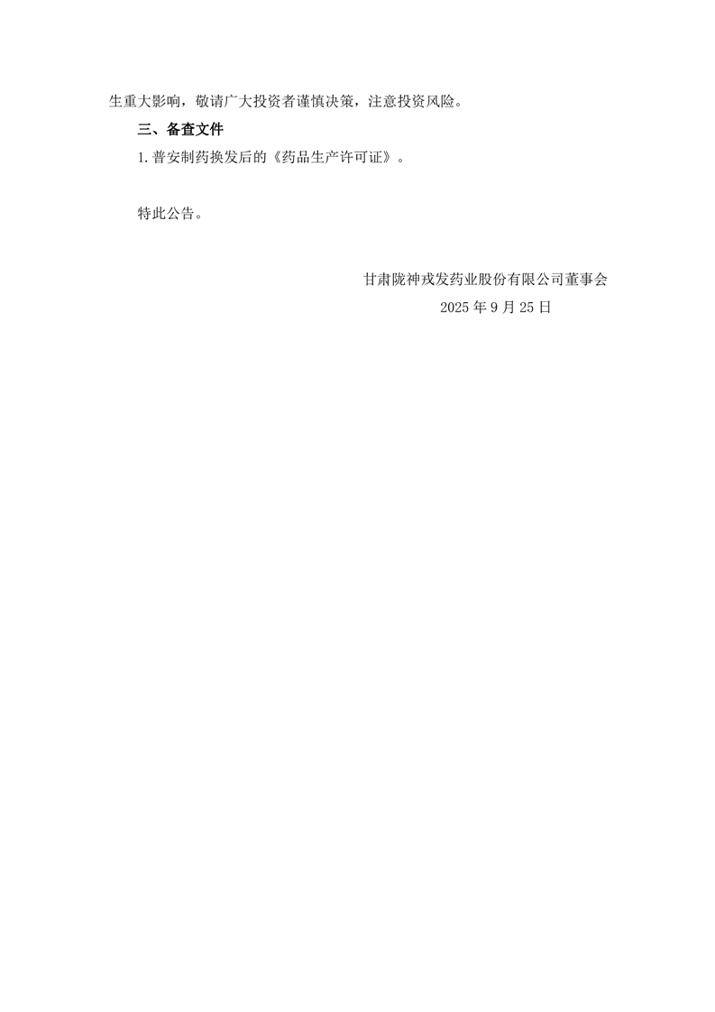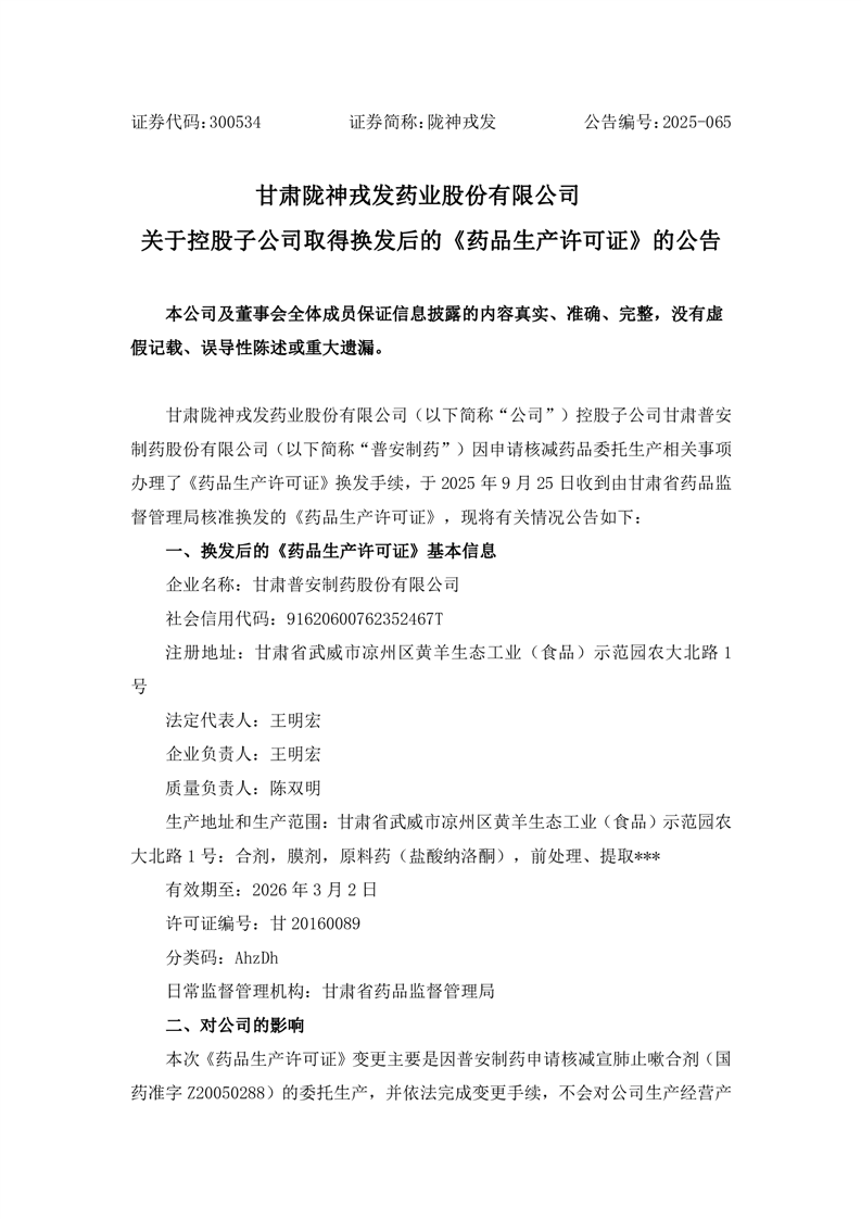 關(guān)于控股子公司取得換發(fā)后的《藥品生產(chǎn)許可證》的公告